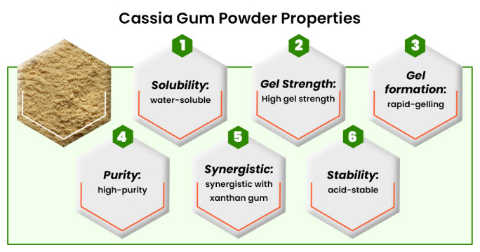 Cassia Gum is simply the purified flour extracted out of the endosperm of the seeds of Cassia tora Cassia obtusifolia of the Leguminosae family. Seeds of the Cassia occidentalis are considered as a contaminant and the gum is acclaimed globally as a thickener, emulsifier, foam stabilizer, moisture retention agent. In frozen dairy products, meat, and poultry products it is used as a texturizing agent. Combining it with hydrocolloids such as Carrageenan or Xanthan gum forms a gel-like substance.
